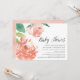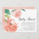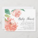 Invitation chic pour une baby shower présentant des illustrations de fleurs de pivoine à l'aquarelle en pêche et rose blush, accentuées de feuilles vertes luxuriantes. Personnalisez avec les détails de votre baby shower alignés à droite. Les cartes présentent au verso un fond lavé à l'aquarelle subtilement teinté de pêche et de blush.