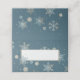 Carte de place mariage pliée à thème Chic Winter en bleu cadet, avec des flocons de neige bleu et or et une plaque en or, sur le devant. L'intérieur de la carte est réalisé dans un style doré. Personnalisez chaque carte à la main, pour votre réception de mariage.