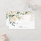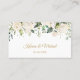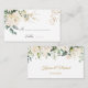 Elégante carte de place avec une illustration de roses blanches, feuillage verdoyant et fleurs dorées en aquarelle.