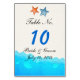 Plage Avec Cartes De Table Mariage Starfish. Grands numéros de table mariage pour les mariages de plage ou de destination. Une plage de sable fin, des vagues et deux étoiles de mer symbolisant la Mariée et la Salle pour vos cartes de table à thème personnalisées sur la plage. Invitations assorties, Mercis et autres produits mariages disponibles.