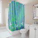 Rideaux de douche rayés couleur verre de mer bleu et vert pour votre bain de plage ou de douche. Créé dans des tons rayés de bleu marine et vert marine de style batik, avec des contrastes marine et blanc. Accentué par l'étoile de mer et votre monogramme. Il suffit de modifier dans le bouton "personnaliser" Zazzle. Voir le matelas de bain et autres articles de décoration correspondants au Camp_and_Cottage de Zazzle.