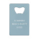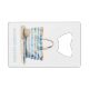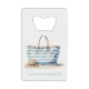 Ce joli ouvre-bouteille de carte de crédit d'inspiration côtière dispose d'un sac fourre-tout de plage à rayures bleues et blanches avec casquette. Personnalisez avec votre choix de nom ou de texte spécial à l'avant et à l'arrière.