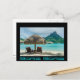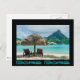 Carte postale avec parasol en chaume et deux chaises longues sur une plage de sable blanc dans un resort luxueux en bungalow surplombant l'eau dans le lagon bleu clair de l'île pacifique de Bora Bora, près de Tahiti en Polynésie française avec une bordure noire et le texte : 'Bora Bora'.