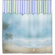 rideau de douche en tissu tropical réalisé dans les graphiques d'une belle scène de plage de sable avec palmiers et eau bleue. Un valet rayé bleu, vert et blanc, de l'autre côté, donne l'impression d'une cabane de style tente.