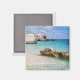 Aimant photo souvenir avec de gros rochers dans l'eau et dans le sable de la plage de Cala Mariolu dans le golfe d'Orosei à la côte d'émeraude de l'île Sardaigne dans la mer Méditerranée, Italie avec le texte : "Sardaigne, Golfo di Orosei".