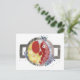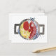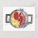 Une langouste qui frite sur une plage à l'intérieur d'une casserole de cuisine placée sur une carte postale.