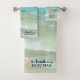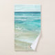 Créez une ambiance de spa et de vacances en bord de mer avec cette serviette de bain côtière cool avec aquarelle tropicale turquoise et vagues de l'océan de mer, étoiles de corail et "la plage est mon endroit heureux" légende dans une écriture marine bleu marine. Art par KL Stock