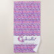 Nom monogramme G personnalisé et signifiant serviette de plage. Jolie lettre manuscrite G nom monogramme et signifiant serviette de fille en violet, rose et blanc. Idéal pour un cadeau personnalisé pour une fille qui a un nom qui commence par la lettre G. Cet exemple lit Gabrielle Dédiée, joyeuse, compatissante ou vous pouvez customiser le texte avec votre propre nom et message ou mots. Fait une fille unique, anniversaire, fêtes, aller à l'uni ou un cadeau de fête. © Lettre typographique G fleurs et coeurs dessin de main et motif unique créé par Sarah Trett. www.sarahtrett.com pour www.mylittleeden.com