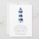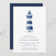 Les invitations à nos fiançailles chic côtier sont illustrées par un phare bleu et blanc à aquarelle, avec les détails de votre fiançailles sous le lettrage bleu marine nautique.