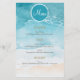 Plage, Océan Aquarelle Arrière - plan menu Mariage Ce magnifique menu mariage saisissant capture la beauté sereine d'un thème côtier avec son aquarelle arrière - plan dans les tons bleu et beige doux, rappelant l'océan et les plages de sable. Le design se compose d'un cadre circulaire aux bords blancs délicats, donnant l'effet de vagues qui lèvent doucement le rivage. Les noms du couple sont élégamment écrits dans une police de script fluide, ajoutant une touche romantique, tandis que les détails sont affichés dans une police serif propre dans un ton chaud et or. Parfait pour un mariage sur la plage ou à destination, cette invitation exhale calme et élégance, invitant les invités à se joindre à une célébration remplie d'amour et de beauté naturelle. F008
