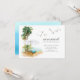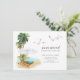 Plage aquarelle moderne avec deux transats, parasol blanc, palmiers & mouettes faire-part côtière en mouvement.