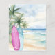 Une invitation à une fête de retraite, pour hommes et femmes. Plage de sable couleur eau, vagues de l'océan et palmiers en arrière - plan, planche de surf bleue et rose. 1 feuille = 1 invite imprimé bord à bord.