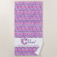 Serviette de plage personnalisée avec monogramme C, nom et signification. Jolies initiales dessinées à la main, lettre C monogramme, nom et signification, serviette pour filles en violet, rose et blanc. Idéal comme cadeau personnalisé pour une fille dont le nom commence par la lettre C. Cet exemple indique Chloe Blooming. Une déesse sincère et terre à terre ou vous pouvez personnaliser le texte avec votre propre nom et message ou mots. Fait un cadeau unique pour les filles, anniversaire, vacances ou célébration. © Lettre typographique C fleurs et cœurs dessinés à la main et motif créés de manière unique par Sarah Trett. www.sarahtrett.com pour www.mylittleeden.com