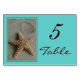 Cette superbe carte de numéros de table de mariage à thème de plage comprend une photo d'une étoile de mer dans le sable comme point focal avec votre numéro de table customisé à droite de la photo. Il s'agit d'une carte numéro de table pour un mariage à thème de plage. Copyright henishouseo