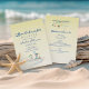 Simple et moderne week-end de plage Bachelorette invitation itinéraire avec horaire personnalisé à l'arrière et coloré illustrations de plage tropicale, simple script de calligraphie bleue sur un arrière - plan jaune ensoleillé.
