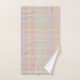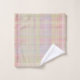 Pour une suggestion de couleurs pastel paradisiaques, un imprimé plaid Glen multicolore avec de l'or, perwinkle, mauve, menthe, pêche, le tout agréablement muet avec une myriade de lignes blanches fines et des lignes plus foncées pour une texture, sur un ensemble de serviettes de bain.