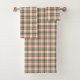 Plaid-patterned towel set with red, green, and yellow lines on a white background. The set includes a larger towel, a smaller towel, and a washcloth.