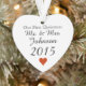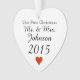 Le design est destiné uniquement aux ornements en forme de coeur. Tout le texte est personnalisable. Lit "Notre premier Noël, M. & Mme, Nom, (assurez-vous de mettre à jour ce champ avec votre nom de famille personnalisé,) et le texte de l'année en cours, (veillez à mettre à jour ce champ avec l'année en cours après 2015.