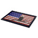 Un aigle à tête blanche scanne le ciel de sa perche sur une branche d'arbre ; superposé sur un drapeau des Etats-Unis.