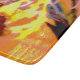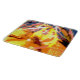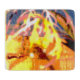 L'oeuvre abstraite de cette planche à découper 6"x7" a été réalisée à partir d'une photo de closeup originale de HomeWare de gouttes de pluie sur un plante de palmier de corail. Le design photo est dans des couleurs tropicales ensoleillées, jaune vif, rose, orange, terre cuite, bleu et blanc.