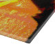 L'oeuvre abstraite de cette planche à découper de 15"x11" a été réalisée à partir d'une photo de closeup originale de HomeWare de gouttes de pluie sur un plante de palmier de corail. Le design photo est dans des couleurs tropicales ensoleillées, jaune vif, rose, orange, terre cuite, bleu et blanc.