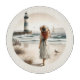 Une jeune femme gracieuse, vêtue d'une robe blanche qui coule le long du rivage sablonneux, son casquette du soleil penche contre la brise en contemplant un phare rayé debout contre les vagues. Des herbes douces encadrent l'avant-plan tandis que des oiseaux marins et un voilier dérivent à travers l'horizon, ajoutant un sentiment de mouvement calme au paysage côtier. La douce aquarelle mêle romantisme et sérénité, créant une scène balnéaire intemporelle d'inspiration cottagecore, à la fois nostalgique et rêveuse. L'IA a généré des oeuvres d'art.