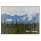 Scène estivale typique au Yukon et dans d'autres régions du Nord. Terrain plat et marécageux dominé par l'épinette noire. Les nuages s'accrochent à une chaîne de montagnes lointaine. Le texte "Le Yukon" apparaît également. Une belle terre fragile.