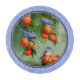 Deux bleuets de l'ouest perchent dans un pêcher tandis qu'un troisième bleu est assis sur un panier en bois tressé rempli de fruits frais récoltés prêts à être commercialisés. Accentué par un arrière - plan à motifs bleus assorti.