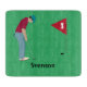 Un golfeur vert vif et personnalisé, portant un casquette, une chemise rouge profonde et un pantalon bleu, mettant une planche à découper de balle de golf.