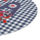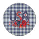 La planche à découper colorée Americana présente les USA en lettres d'art folklorique décorées en rouge et bleu avec bouquet floral rouge et bleu sur marine en vichy à damiers arrière - plan. Décor du jour de l'Indépendance parfait