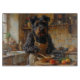Bring rustic charm and strength into your kitchen with this Bouvier des Flandres design featuring a shaggy pup cooking in a cozy setting. With its thick coat, distinctive beard, and calm expression, this artwork captures the breed’s hardworking and loyal personality.