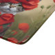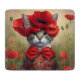 Un chat tigré royal se tient debout au milieu d'un champ de coquelicots rouges vibrants. Le félin est orné d'un grand chapeau en fleur de coquelicot, d'un nœud papillon rouge assorti et d'une robe verte élégante à motif de coquelicots rouges délicats. L'expression sérieuse du chat et sa tenue élégante créent un portrait fantaisiste et charmant.