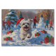 Un maltais moelleux traverse joyeusement le paysage enneigé, vêtu d'un casquette de Noël rouge et festif. Cette charmante scène hivernale met en valeur le manteau soyeux de la race, sa personnalité ludique et son esprit gai tout en capturant la chaleur et la magie de la saison des fêtes. Un design charmant, plein de charme festif.