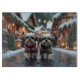 Cette conception festive capture l'esprit joyeux de la saison des fêtes, avec un adorable chien. Niché dans un pays des merveilles hivernal, avec un arbre de Noël décoré et des cadeaux magnifiquement emballés. Les flocons de neige tombent doucement, ajoutant une touche magique à la scène, tandis que les couleurs vives des décorations de Noël créent une atmosphère chaleureuse et joyeuse.