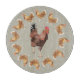 Cette planche à découper comporte une bordure de poules brunes avec un coq central. Un accessoire coloré pour la cuisine.