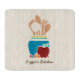 Ajoutez une touche d'hospitalité à votre cuisine avec cette jolie planche à découper de style champêtre avec un ensemble dessiné à la main de cuillères en bois et d'ustensiles de cuisine dans une marmite turquoise entourée d'une délicieuse pomme rouge et de fruits frais. Ce design à thème de cuisine de campagne sur un arrière - plan motif en bois clair peut être personnalisé en ajoutant votre nom.