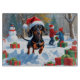 Un Dachshund ludique traverse la scène hivernale enneigée, portant un casquette de Noël rouge festif. Ce design charmant met en valeur le long corps, les jambes courtes et la personnalité spirituelle de la race tout en captant la chaleur et la joie de la saison des fêtes. Un délicieux moment d'hiver plein de joie festive.