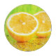 Citron tranché sur une surface réfléchissante verte avec des gouttes d'eau brillantes.