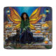 Une fée aux ailes orange et jaune sur des marches en pierre qui mènent peut-être au royaume des Fées. La Fée afro-américaine n'est pas seule, elle est avec son chien doberman gardien ce jour d'automne.
