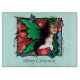 Une fée aux cheveux noirs portant tout rouge avec des ailes de fées vertes. Des flocons de neige, des poinsettites rouges et des papillons bleus tout autour de la fée.