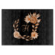 Planche à découper personnalisée avec fleurs en noir, marron et pêche. Disponible en tailles rectangle et cercle.