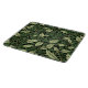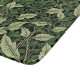 Un imprimé feuillage avec un feuille vert clair presque olive ou sage entrelacé dans des verts plus foncés. Une ombre de vert chasseur ou de vert foncé de forêt crée la grande majorité des feuilles. Sur un arrière - plan de noir.