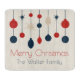 Joli rétro Joyeux plateau de Noël avec des ornements de style 70 vintages en rouge, bleu et ivoire au-dessus de votre nom de famille. Belle décoration de cuisine de vacances nostalgique cadeau pour votre maison.