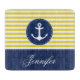 Belle planche à découper avec ancrage nautique, rayures jaunes et bleues et texte personnalisé.