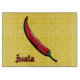 Un piment de jwala rouge, également connu sous le nom de poivre chaud indien, est décoré de motifs inspirés des médailles indiennes et est assis sur un arrière - plan jaune avec une version plus petite du même motif et un étiquette de script dans le coin. Ce poivre modérément épicé sert à réchauffer des curries authentiques et d'autres plats indiens.