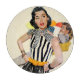 Artiste : Mike Ludlow | Femme en robe rayée noire et blanche regarde l'homme sur le canapé