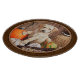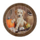 A yellow Labrador retriever puppy among an autumn harvest of pumkins, gourds, Indian corn, and a hay bale. Et old wood barn wall in the background is decorated with an old rusty horseshoe and turkey feathers. All on a earth toned patterned background perfect for that rustic country home. Réaliste artwork created from an original oil painting by animal artist Crista S. Forest.