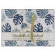 Ajoutez la nouvelle initiale de nom de famille (monogramme) de M. et Mme, leurs prénoms et la date de leur mariage, cérémonie de mariage sur cet élégant cadeau de souvenir de mariage commémoratif monogramme d'or. Aquarelle marine, bleu azur palm tropical feuille motif caractéristique dans l'arrière - plan, avec typographie de style or pour le libellé.
