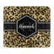 Plateau de découpe en or et empreinte de léopard noir avec un nom personnalisé et modèle monogramme. Un motif poster de animal de safari mignon et branché, arrière - plan surmonté d'un petit morceau de personnalisation.