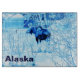 Image bleue et blanche d'un orignal de vache en milieu urbain en hiver. Le texte "Alaska" apparaît également. Les orignaux sont des résidents de nombreuses collectivités de l'Alaska qui vivent toute l'année. Ici à Anchorage il y a environ 1500 animaux, ainsi que des loups, des ours bruns et d'autres animaux sauvages.Ils sont généralement bien élevés. Ils traversent souvent les rues aux passages piétons après avoir attendu un signal de marche. D'une photo d'une orignale qui a traversé ma cour.